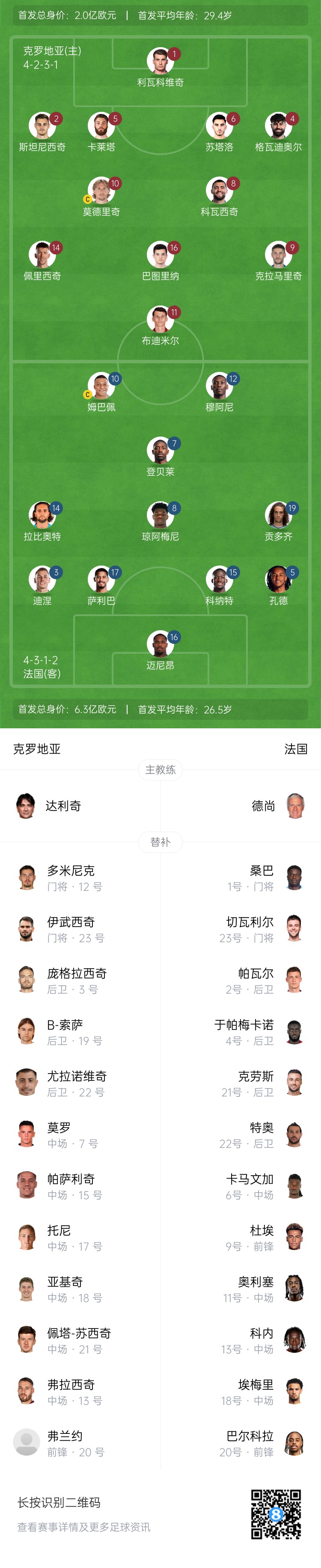 3月21日訊 北京時(shí)間03:45,歐國(guó)聯(lián)1/4賽決賽首回合,克羅地亞坐鎮(zhèn)主場(chǎng)迎戰(zhàn)法國(guó)。賽前官方公布了雙方的首發(fā)名單。